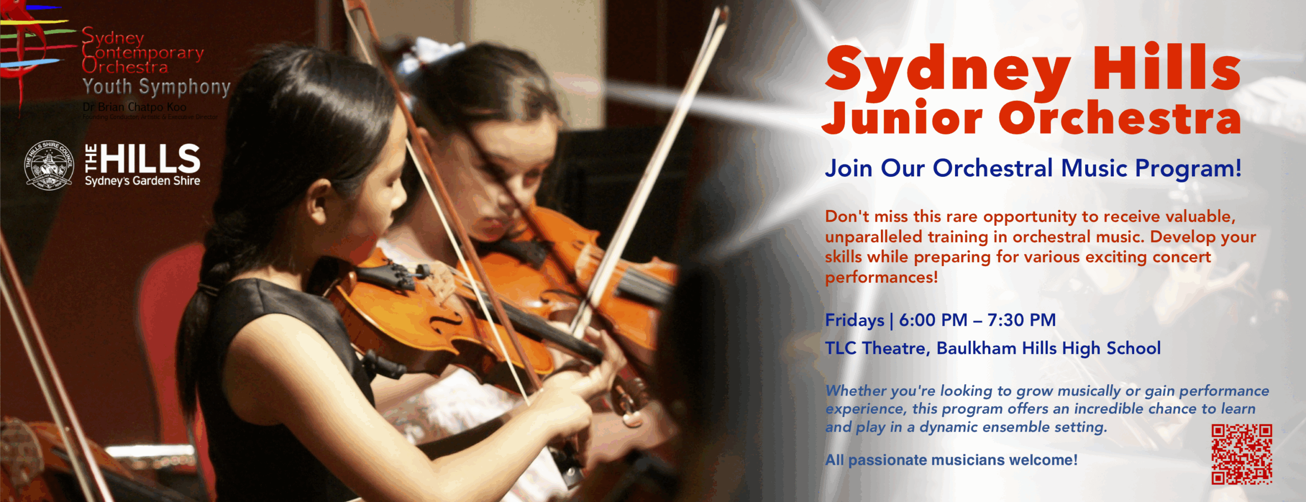 Established in 2011, a training arm of the Sydney Contemporary Orchestra Inc. (SCO), the SCO Youth Symphony (SYS) is our Youth Program for young music lovers, music students, young musicians, and young music teachers in Sydney, Australia. This program consists of the Sydney Hills Youth Orchestra and the Sydney Hills Junior Orchestra.